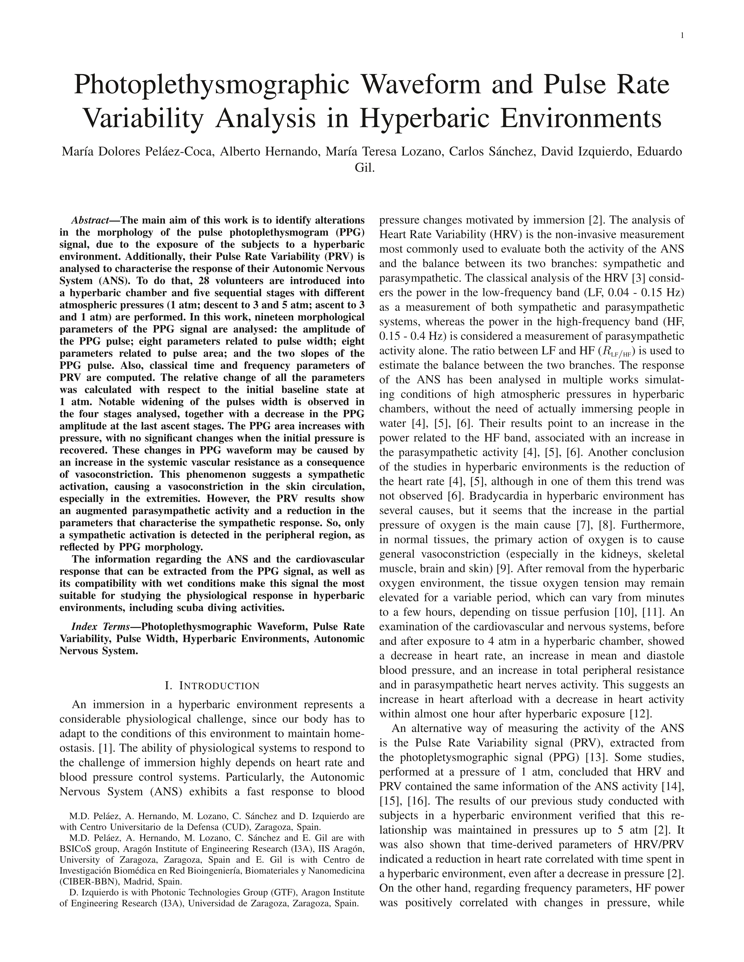 | Página principal > Artículos > Photoplethysmographic Waveform and Pulse Rate Variability Analysis in Hyperbaric Environments |