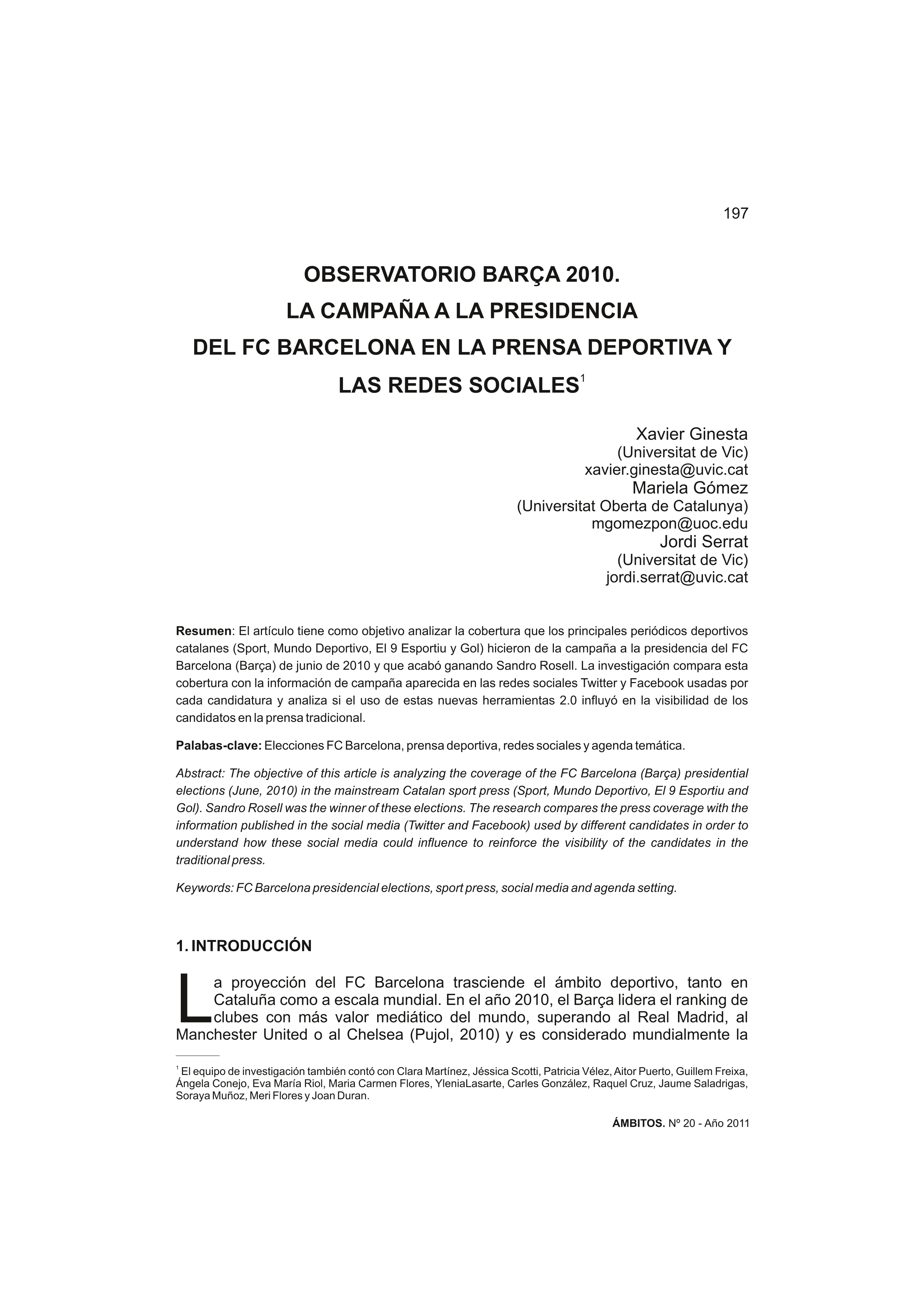 Resumen: El artículo tiene como objetivo analizar la cobertura que los principales periódicos deportivos catalanes (Sport, Mundo Deportivo, El 9 Esportiu y Gol) hicieron de la campaña a la presidencia del FC Barcelona (Barça) de junio de 2010 y que acabó ganando Sandro Rosell. La investigación compara esta cobertura con la información de campaña aparecida en las redes sociales Twitter y Facebook usadas por cada candidatura y analiza si el uso de estas nuevas herramientas 2.0 influyó en la visibilidad de los candidatos en la prensa tradicional. Idioma: Español Año: 2011 Publicado en: Ámbitos (Sevilla) 20 (2011), 197-215 ISSN: 1139-1979 Originalmente disponible en: Texto completo de la revista