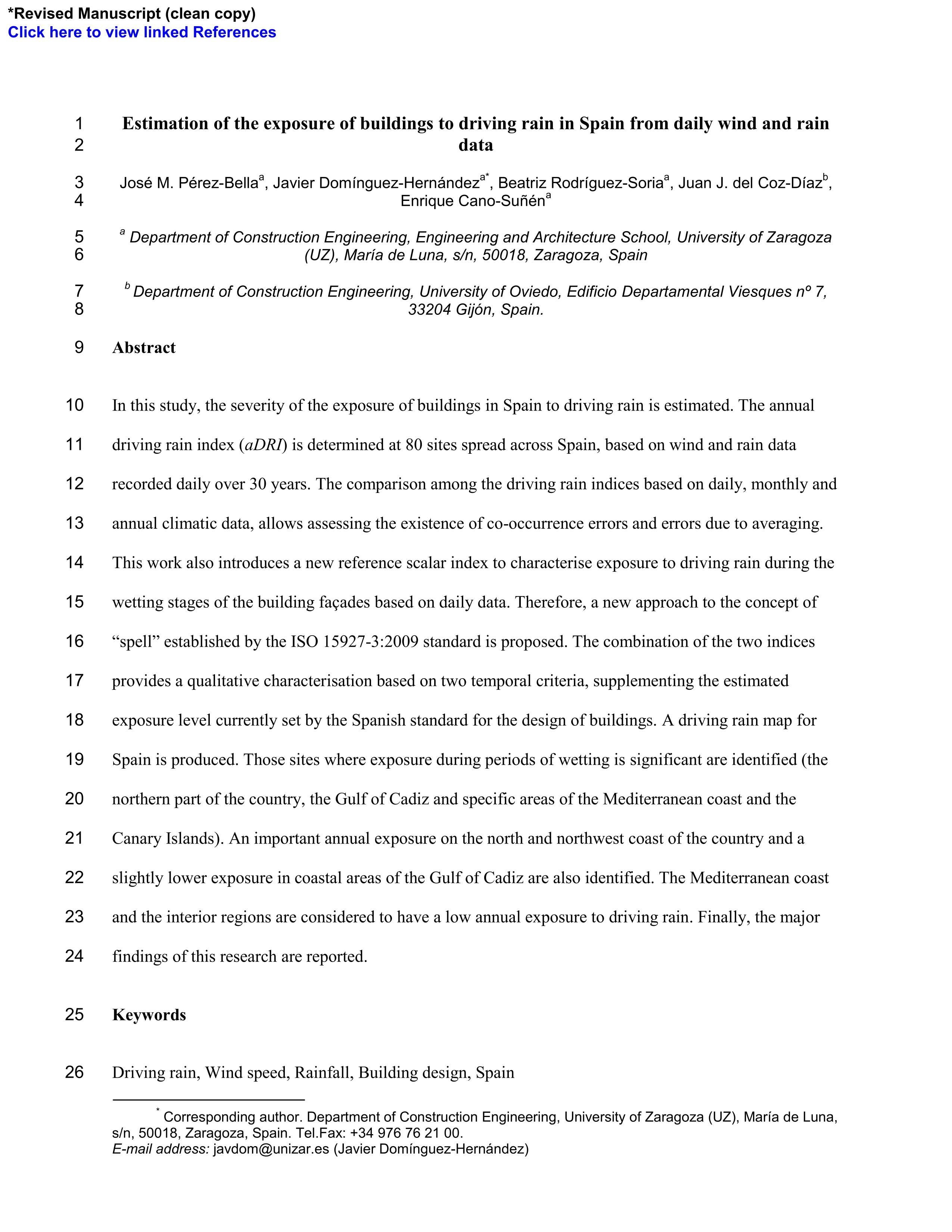 Resumen: In this study, the severity of the exposure of buildings in Spain to driving rain is estimated. The annual driving rain index (aDRI) is determined at 80 sites spread across Spain, based on wind and rain data recorded daily over 30 years. The comparison among the driving rain indices based on daily, monthly and annual climatic data, allows assessing the existence of co-occurrence errors and errors due to averaging. This work also introduces a new reference scalar index to characterise exposure to driving rain during the wetting stages of the building façades based on daily data. Therefore, a new approach to the concept of “spell” established by the ISO 15927-3:2009 standard is proposed. The combination of the two indices provides a qualitative characterisation based on two temporal criteria, supplementing the estimated exposure level currently set by the Spanish standard for the design of buildings. A driving rain map for Spain is produced. Those sites where exposure during periods of wetting is significant are identified (the northern part of the country, the Gulf of Cadiz and specific areas of the Mediterranean coast and the Canary Islands). An important annual exposure on the north and northwest coast of the country and a slightly lower exposure in coastal areas of the Gulf of Cadiz are also identified. The Mediterranean coast and the interior regions are considered to have a low annual exposure to driving rain. Finally, the major findings of this research are reported. Idioma: Inglés DOI: 10.1016/j.buildenv.2012.05.010 Año: 2012 Publicado en: Building and Environment 57 (2012), 259-270 ISSN: 0360-1323 Factor impacto JCR: 2.43 (2012) Categ. JCR: CONSTRUCTION & BUILDING TECHNOLOGY rank: 6 / 57 = 0.105 (2012) - Q1 - T1 Categ. JCR: ENGINEERING, CIVIL rank: 8 / 121 = 0.066 (2012) - Q1 - T1 Categ. JCR: ENGINEERING, ENVIRONMENTAL rank: 14 / 42 = 0.333 (2012) - Q2 - T2 Financiación: info:eu-repo/grantAgreement/ES/MICINN/BIA2008-00058 Tipo y forma: Artículo (PostPrint) Área (Departamento): Area Ingeniería Construcción (Dpto. Ingeniería Mecánica)