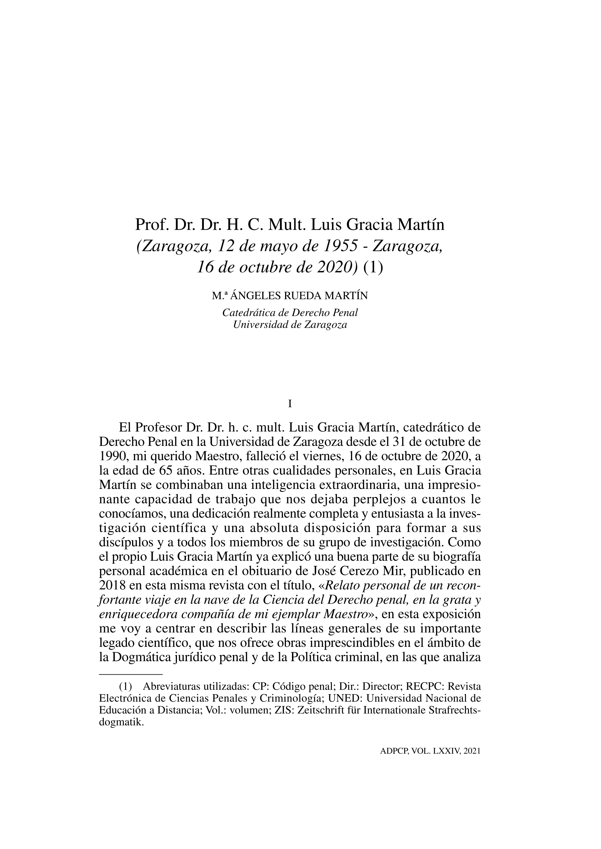 Resumen: El Profesor Dr. Dr. h. c. mult. Luis Gracia Martín, catedrático de Derecho Penal en la Universidad de Zaragoza desde el 31 de octubre de 1990, mi querido Maestro, falleció el viernes, 16 de octubre de 2020, a la edad de 65 años. Entre otras cualidades personales, en Luis Gracia Martín se combinaban una inteligencia extraordinaria, una impresionante capacidad de trabajo que nos dejaba perplejos a cuantos le conocíamos, una dedicación realmente completa y entusiasta a la investigación científica y una absoluta disposición para formar a sus discípulos y a todos los miembros de su grupo de investigación. Idioma: Español DOI: 10.53054/adpcp.v74i1.7890 Año: 2021 Publicado en: Anuario de derecho penal y ciencias penales 74, 1 (2021), 23-44 ISSN: 0210-3001 Tipo y forma: Artículo (Versión definitiva) Área (Departamento): Área Derecho Penal (Dpto. Dcho.Pe.,Filos.D.e Hª D.)