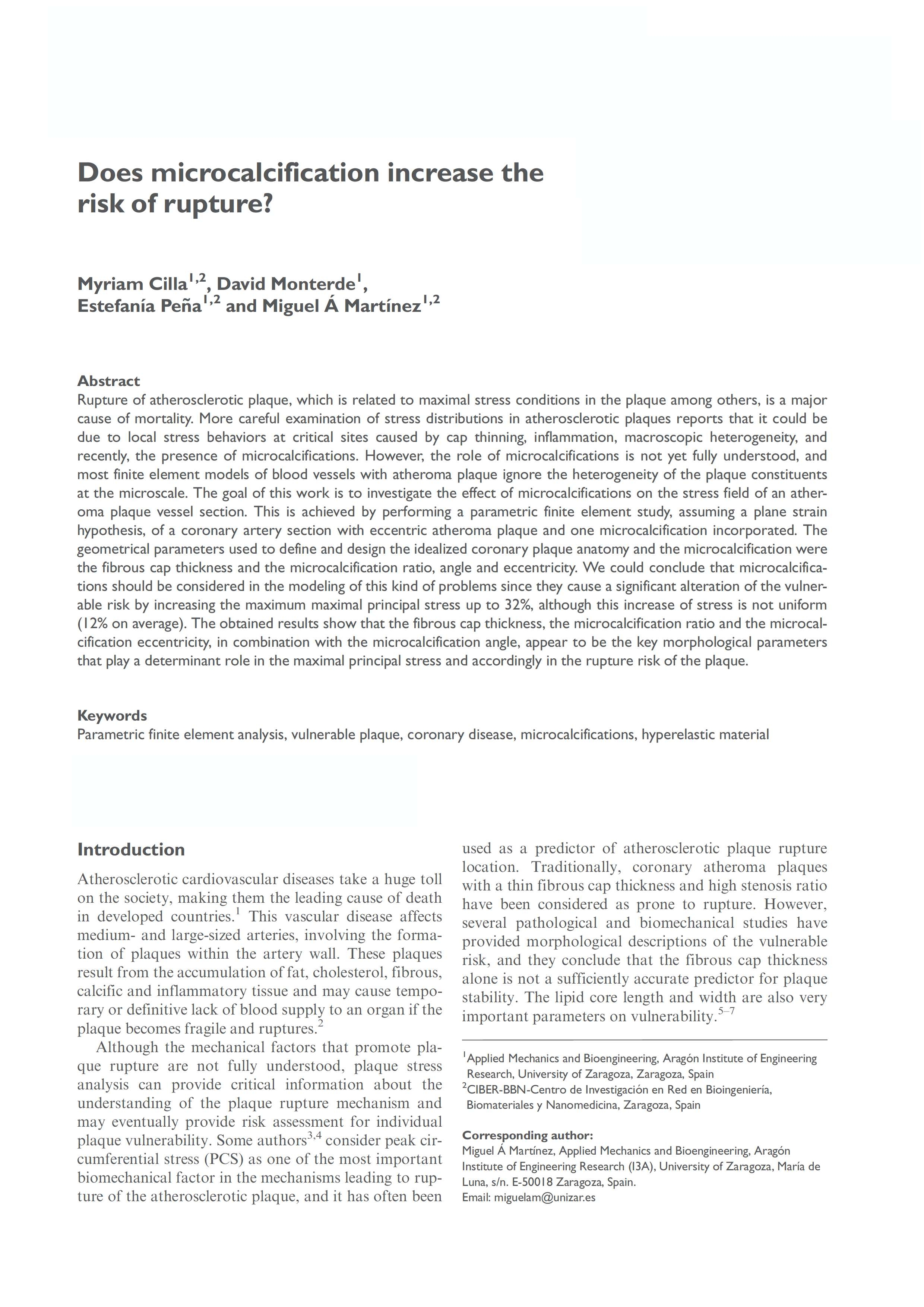 Resumen: Rupture of atherosclerotic plaque, which is related to maximal stress conditions in the plaque among others, is a major cause of mortality. More careful examination of stress distributions in atherosclerotic plaques reports that it could be due to local stress behaviors at critical sites caused by cap thinning, inflammation, macroscopic heterogeneity, and recently, the presence of microcalcifications. However, the role of microcalcifications is not yet fully understood, and most finite element models of blood vessels with atheroma plaque ignore the heterogeneity of the plaque constituents at the microscale. The goal of this work is to investigate the effect of microcalcifications on the stress field of an atheroma plaque vessel section. This is achieved by performing a parametric finite element study, assuming a plane strain hypothesis, of a coronary artery section with eccentric atheroma plaque and one microcalcification incorporated. The geometrical parameters used to define and design the idealized coronary plaque anatomy and the microcalcification were the fibrous cap thickness and the microcalcification ratio, angle and eccentricity. We could conclude that microcalcifications should be considered in the modeling of this kind of problems since they cause a significant alteration of the vulnerable risk by increasing the maximum maximal principal stress up to 32%, although this increase of stress is not uniform (12% on average). The obtained results show that the fibrous cap thickness, the microcalcification ratio and the microcalcification eccentricity, in combination with the microcalcification angle, appear to be the key morphological parameters that play a determinant role in the maximal principal stress and accordingly in the rupture risk of the plaque. Idioma: Inglés DOI: 10.1177/0954411913479530 Año: 2013 Publicado en: PROCEEDINGS OF THE INSTITUTION OF MECHANICAL ENGINEERS PART H-JOURNAL OF ENGINEERING IN MEDICINE 227, 5 (2013), 588-599 ISSN: 0954-4119 Factor impacto JCR: 1.144 (2013) Categ. JCR: ENGINEERING, BIOMEDICAL rank: 53 / 75 = 0.707 (2013) - Q3 - T3 Financiación: info:eu-repo/grantAgreement/ES/MINECO/DPI2010-20746-C03-01 Tipo y forma: Artículo (PostPrint) Área (Departamento): Área Mec.Med.Cont. y Teor.Est. (Dpto. Ingeniería Mecánica)