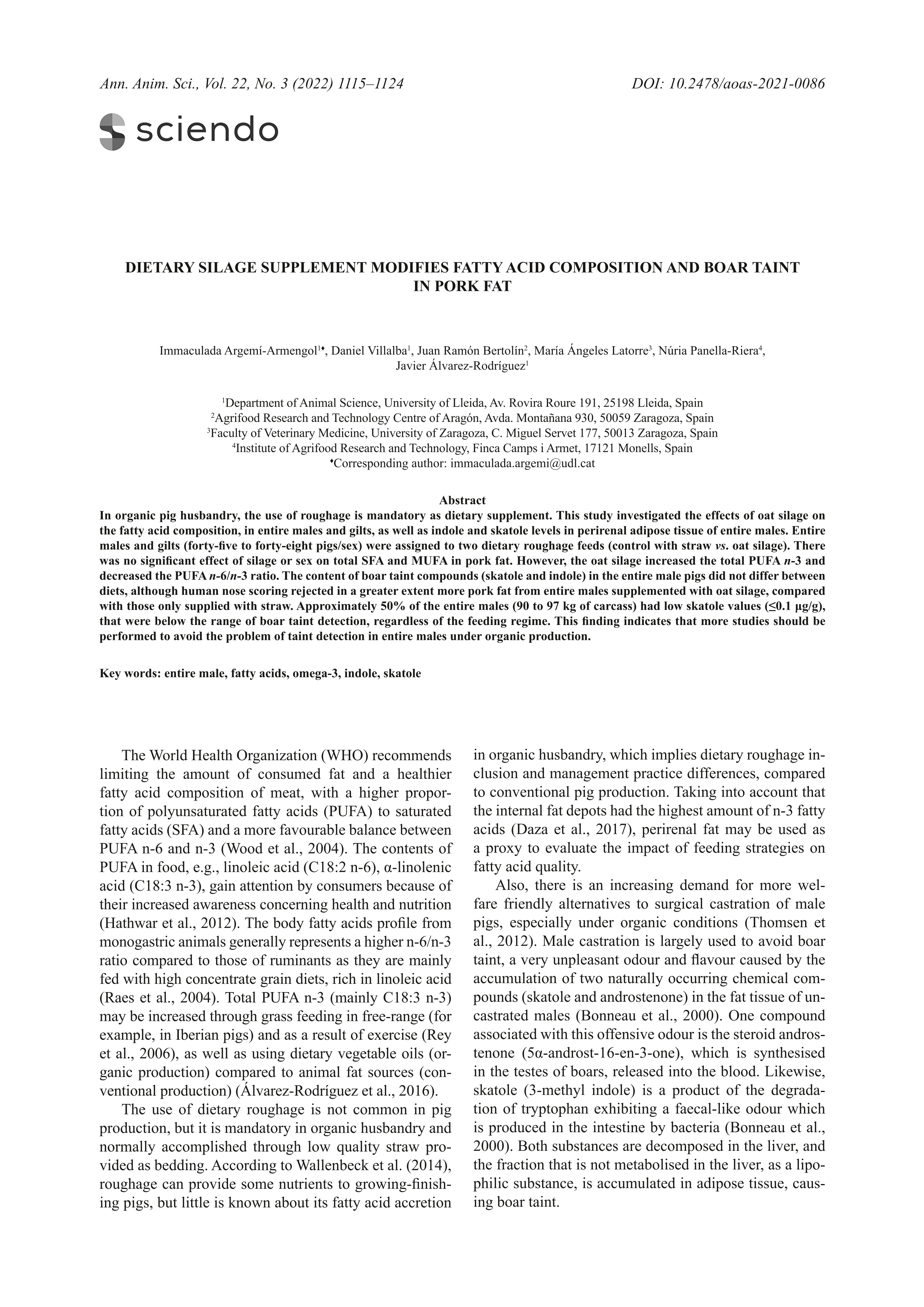 Dietary silage supplement modifies fatty acid composition and boar taint in pork fat