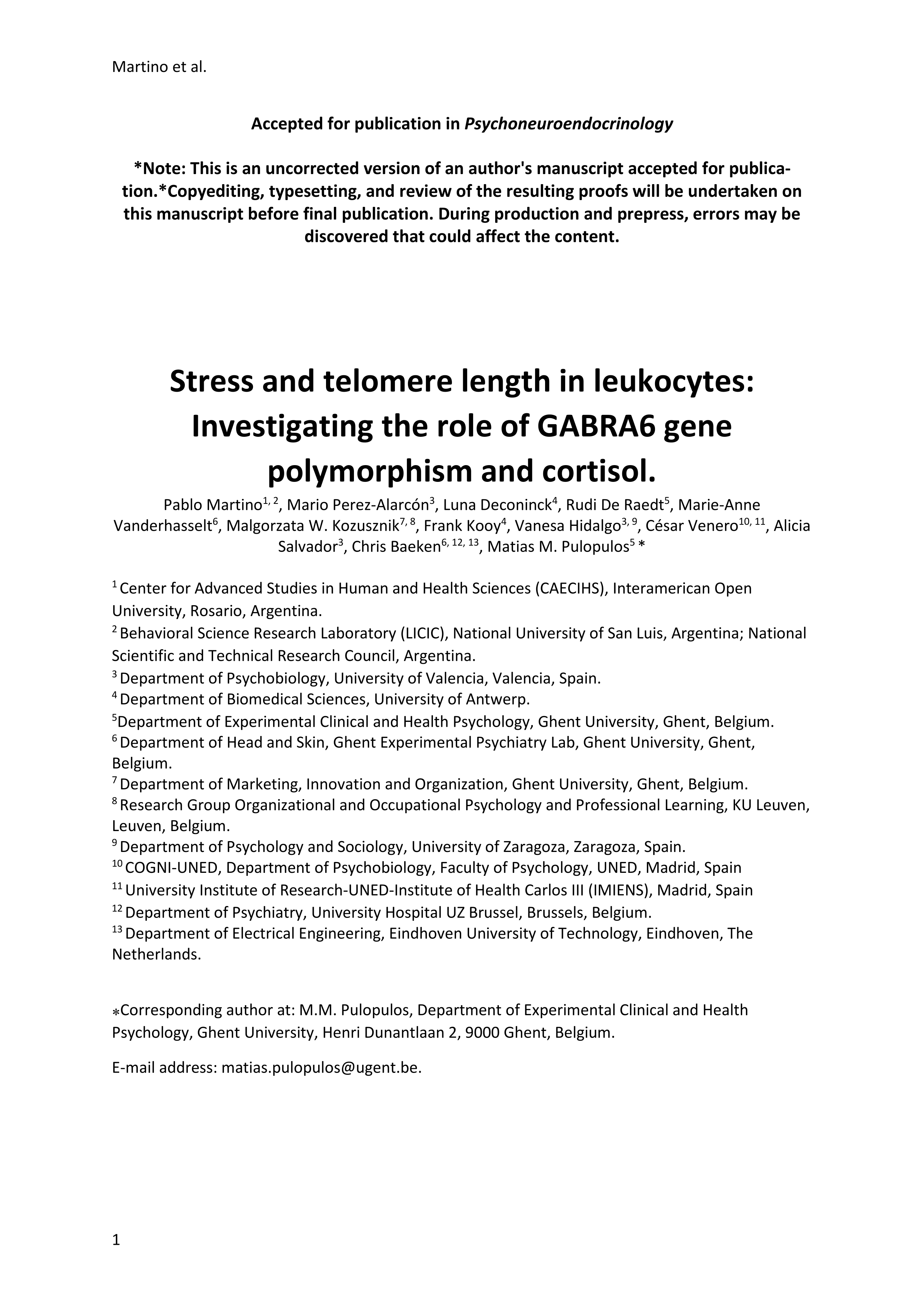 Resumen: Telomere length (TL) is considered a biomarker of aging, and short TL in leukocytes is related to age and stress-related health problems. Cumulative lifetime stress exposure has also been associated with shorter TL and age-related health problems, but the mechanisms are not well understood. We tested in 108 individuals whether shorter TL in leukocytes is observed in individuals with the GABRA6 TT genotype, which has been associated with dysregulation of hypothalamic-pituitary-adrenal axis activity (the main biological stress system) compared to the CC genotype. We also investigated if individuals carrying the TT genotype show higher stress-induced and diurnal cortisol secretion and if cortisol explains the interindividual variability in TL. The analysis pipeline of this study was pre-registered, and the results showed that GABRA6 TT carriers had shorter TL in CD8+CD28+ cells (Bonferroni corrected). In contrast to previous studies, no differences between groups in cortisol secretion were observed, and TL and cortisol did not show significant associations. This study shows, for the first time, shorter TL in CD8+CD28+ cells in TT carriers for GABRA6 compared to CC carriers, suggesting accelerated cellular aging. Although this difference could be linked to an increased susceptibility to stress in the TT carriers, this could not be attributed to the direct influence of cortisol, suggesting the involvement of other mechanisms. Idioma: Inglés DOI: 10.1016/j.psyneuen.2025.107358 Año: 2025 Publicado en: PSYCHONEUROENDOCRINOLOGY 173 (2025), 107358 [10 pp.] ISSN: 0306-4530 Financiación: info:eu-repo/grantAgreement/ES/DGA/S31-23R Financiación: info:eu-repo/grantAgreement/ES/AEI/MICNN/PID2021–125945OB-I00 Tipo y forma: Article (PostPrint) Área (Departamento): Área Psicobiología (Dpto. Psicología y Sociología)