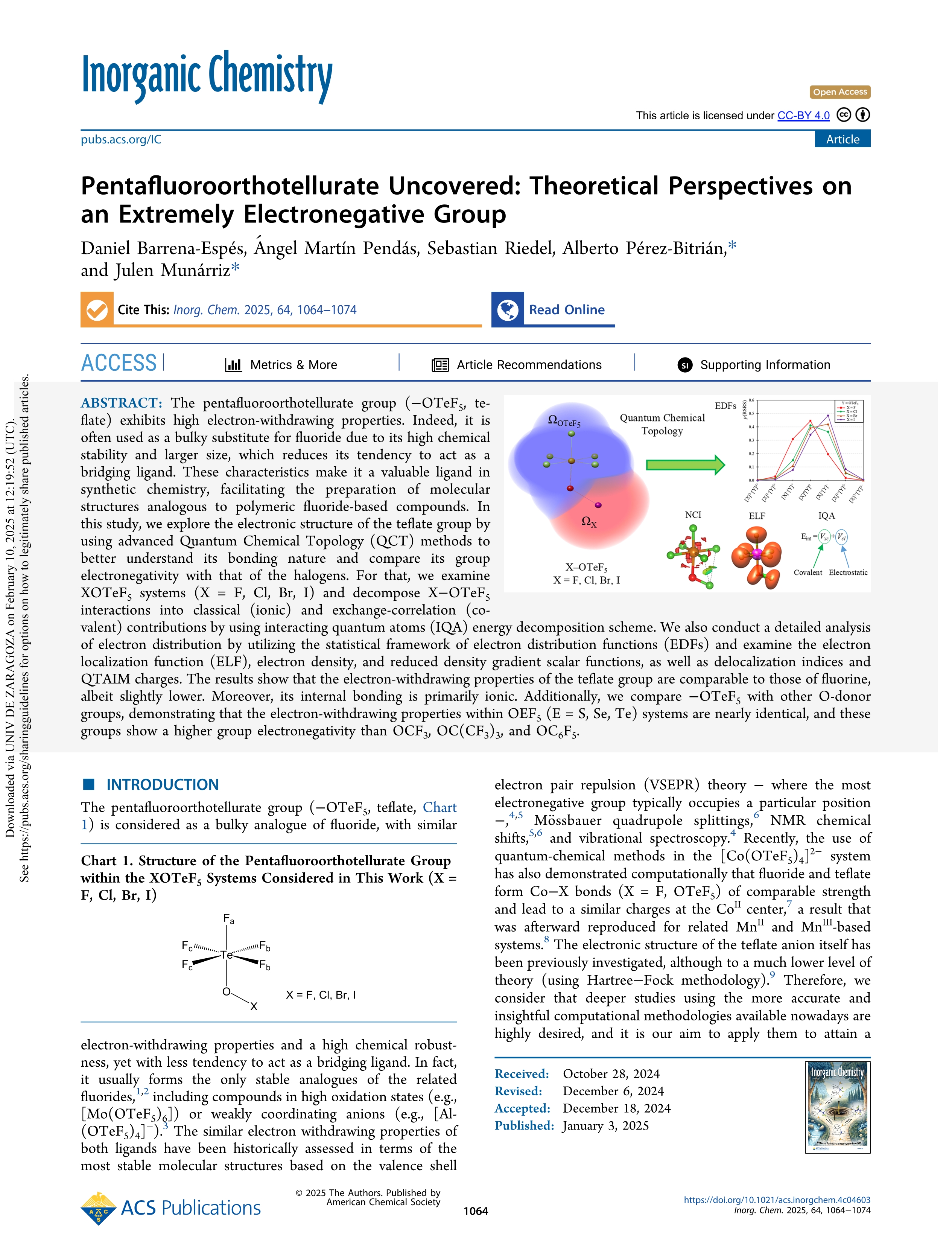 Resumen: The pentafluoroorthotellurate group (−OTeF5, teflate) exhibits high electron-withdrawing properties. Indeed, it is often used as a bulky substitute for fluoride due to its high chemical stability and larger size, which reduces its tendency to act as a bridging ligand. These characteristics make it a valuable ligand in synthetic chemistry, facilitating the preparation of molecular structures analogous to polymeric fluoride-based compounds. In this study, we explore the electronic structure of the teflate group by using advanced Quantum Chemical Topology (QCT) methods to better understand its bonding nature and compare its group electronegativity with that of the halogens. For that, we examine XOTeF5 systems (X = F, Cl, Br, I) and decompose X–OTeF5 interactions into classical (ionic) and exchange-correlation (covalent) contributions by using interacting quantum atoms (IQA) energy decomposition scheme. We also conduct a detailed analysis of electron distribution by utilizing the statistical framework of electron distribution functions (EDFs) and examine the electron localization function (ELF), electron density, and reduced density gradient scalar functions, as well as delocalization indices and QTAIM charges. The results show that the electron-withdrawing properties of the teflate group are comparable to those of fluorine, albeit slightly lower. Moreover, its internal bonding is primarily ionic. Additionally, we compare −OTeF5 with other O-donor groups, demonstrating that the electron-withdrawing properties within OEF5 (E = S, Se, Te) systems are nearly identical, and these groups show a higher group electronegativity than OCF3, OC(CF3)3, and OC6F5. Idioma: Inglés DOI: 10.1021/acs.inorgchem.4c04603 Año: 2025 Publicado en: Inorganic Chemistry 64, 2 (2025), 1064-1074 ISSN: 0020-1669 Financiación: info:eu-repo/grantAgreement/ES/DGA/E42-23R Financiación: info:eu-repo/grantAgreement/ES/MICINN/PID2021-122763NB-I00 Financiación: info:eu-repo/grantAgreement/ES/UZ/JIUZ-2023-CIE-10 Tipo y forma: Artículo (Versión definitiva) Área (Departamento): Área Química Física (Dpto. Química Física)
