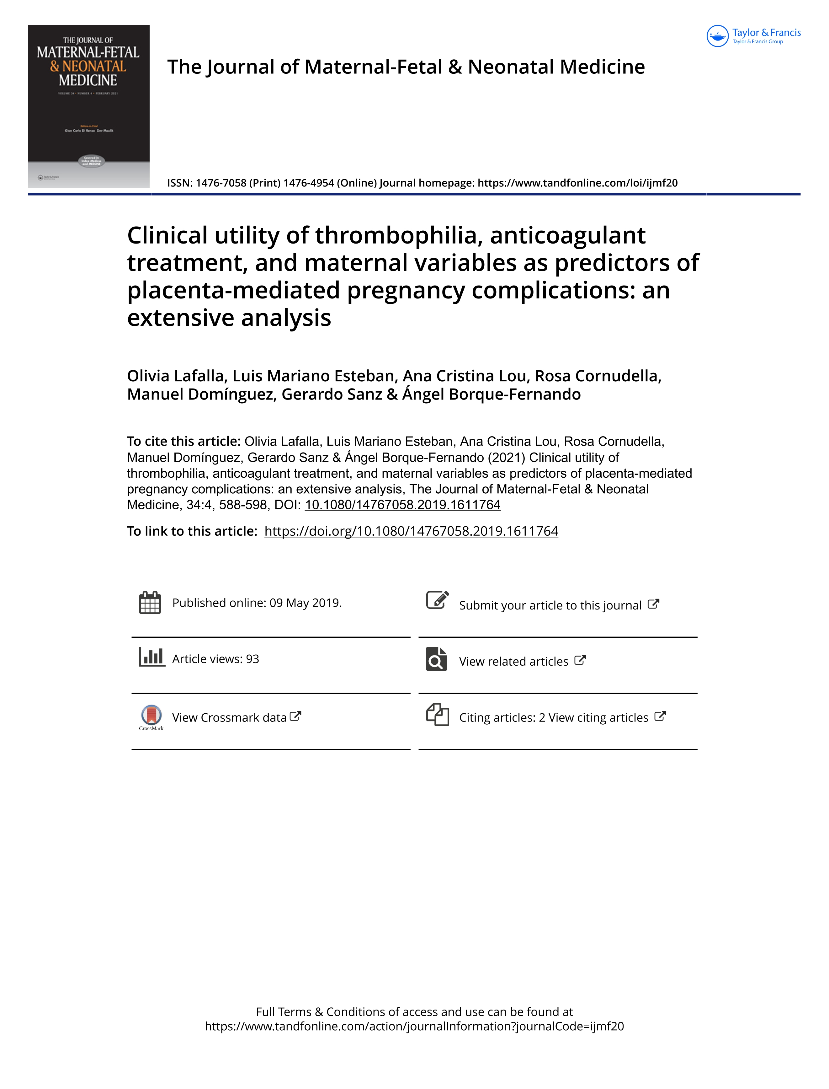 Conclusions: We found risk and protective factors associated with PMPC, but our data were not conclusive to demonstrate its relation with maternal thrombophilia. However, the challenger finding is the clinical utility of antithrombotic drugs as a protective factors in PMPC prevention. It is possible to identify patients with high risk of PMPC through a combined predictive model, for counseling treatment. Idioma: Inglés DOI: 10.1080/14767058.2019.1611764 Año: 2021 Publicado en: Journal of Maternal-Fetal and Neonatal Medicine 34, 4 (2021), 588-598 ISSN: 1476-7058 Factor impacto JCR: 2.323 (2021) Categ. JCR: OBSTETRICS & GYNECOLOGY rank: 61 / 85 = 0.718 (2021) - Q3 - T3 Factor impacto CITESCORE: 4.0 - Medicine (Q2)