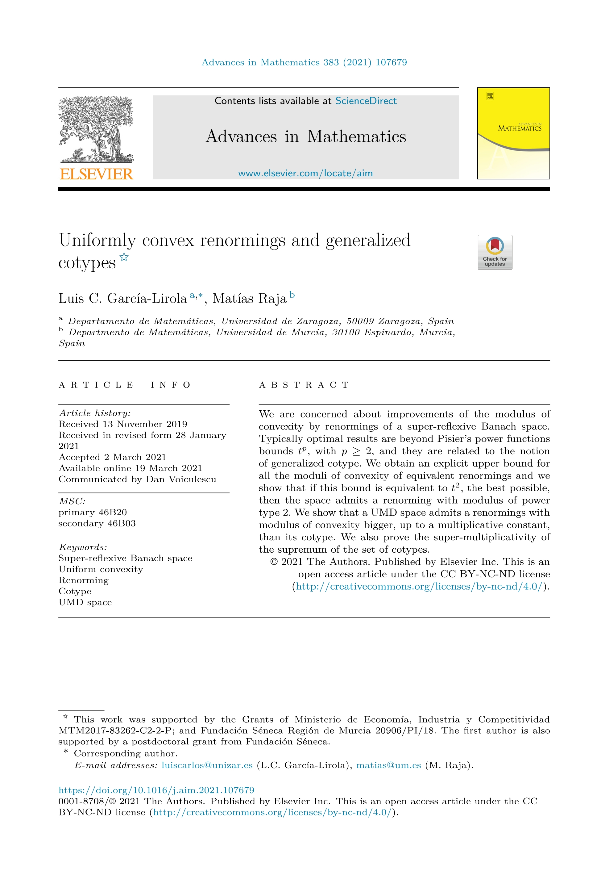 Resumen: We are concerned about improvements of the modulus of convexity by renormings of a super-reflexive Banach space. Typically optimal results are beyond Pisier''s power functions bounds tp, with p=2, and they are related to the notion of generalized cotype. We obtain an explicit upper bound for all the moduli of convexity of equivalent renormings and we show that if this bound is equivalent to t2, the best possible, then the space admits a renorming with modulus of power type 2. We show that a UMD space admits a renormings with modulus of convexity bigger, up to a multiplicative constant, than its cotype. We also prove the super-multiplicativity of the supremum of the set of cotypes. Idioma: Inglés DOI: 10.1016/j.aim.2021.107679 Año: 2021 Publicado en: Advances in Mathematics 383 (2021), 107679 [23 pp.] ISSN: 0001-8708 Factor impacto JCR: 1.675 (2021) Categ. JCR: MATHEMATICS rank: 59 / 333 = 0.177 (2021) - Q1 - T1 Factor impacto CITESCORE: 2.6 - Mathematics (Q2)
