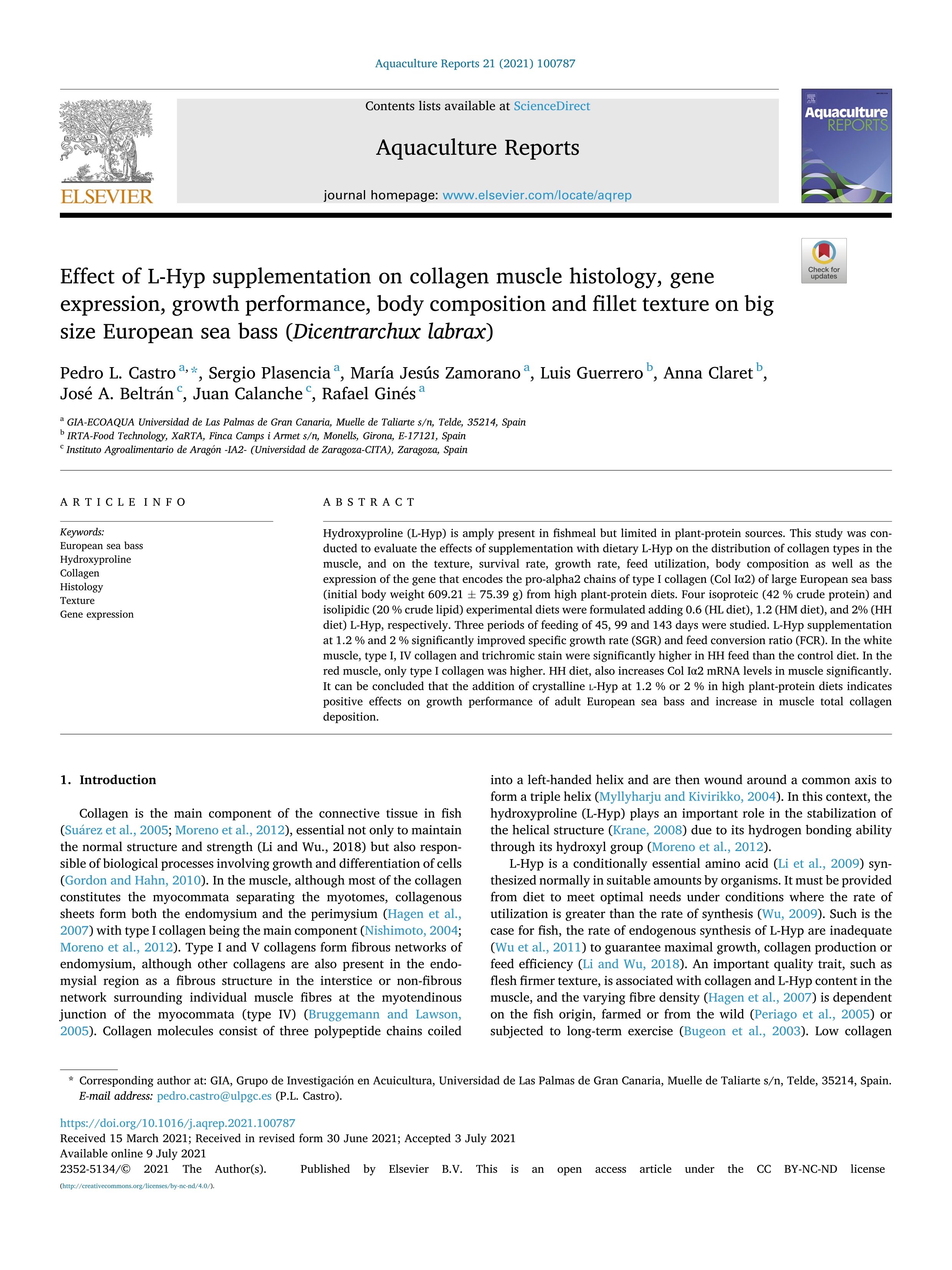 Effect of L-Hyp supplementation on collagen muscle histology, gene expression, growth performance, body composition and fillet texture on big size European sea bass (Dicentrarchux labrax)