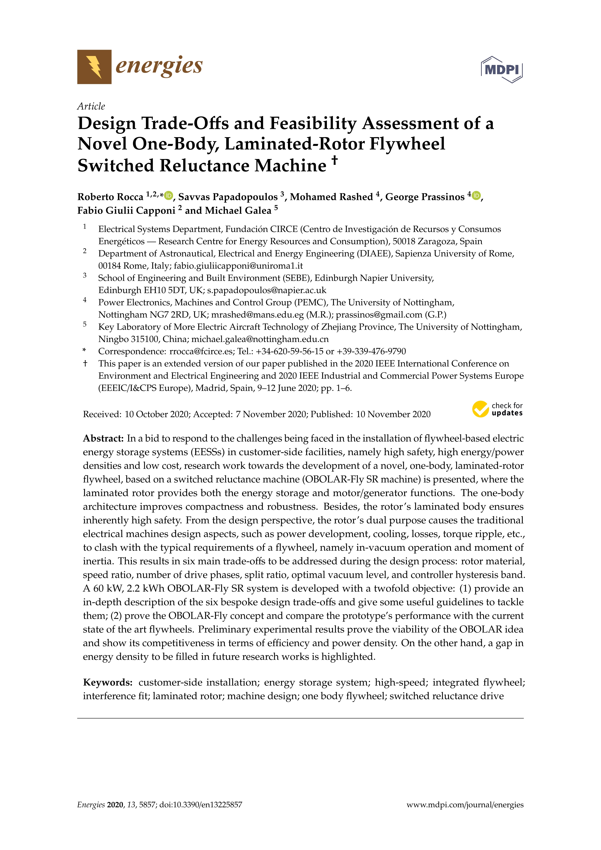 Resumen: In a bid to respond to the challenges being faced in the installation of flywheel-based electric energy storage systems (EESSs) in customer-side facilities, namely high safety, high energy/power densities and low cost, research work towards the development of a novel, one-body, laminated-rotor flywheel, based on a switched reluctance machine (OBOLAR-Fly SR machine) is presented, where the laminated rotor provides both the energy storage and motor/generator functions. The one-body architecture improves compactness and robustness. Besides, the rotor’s laminated body ensures inherently high safety. From the design perspective, the rotor’s dual purpose causes the traditional electrical machines design aspects, such as power development, cooling, losses, torque ripple, etc., to clash with the typical requirements of a flywheel, namely in-vacuum operation and moment of inertia. This results in six main trade-offs to be addressed during the design process: rotor material, speed ratio, number of drive phases, split ratio, optimal vacuum level, and controller hysteresis band. A 60 kW, 2.2 kWh OBOLAR-Fly SR system is developed with a twofold objective: (1) provide an in-depth description of the six bespoke design trade-offs and give some useful guidelines to tackle them; (2) prove the OBOLAR-Fly concept and compare the prototype’s performance with the current state of the art flywheels. Preliminary experimental results prove the viability of the OBOLAR idea and show its competitiveness in terms of efficiency and power density. On the other hand, a gap in energy density to be filled in future research works is highlighted.