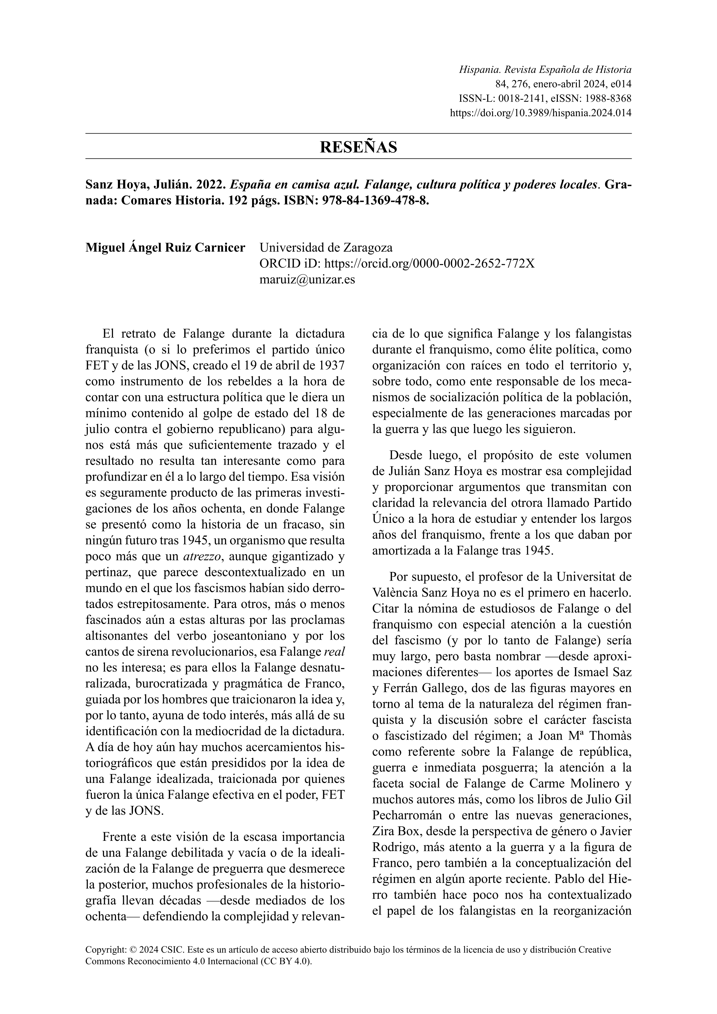 Sanz Hoya, Julián. 2022. España en camisa azul. Falange, cultura política y poderes locales. Granada: Comares Historia. 192 págs. ISBN: 978-84-1369-478-8.
