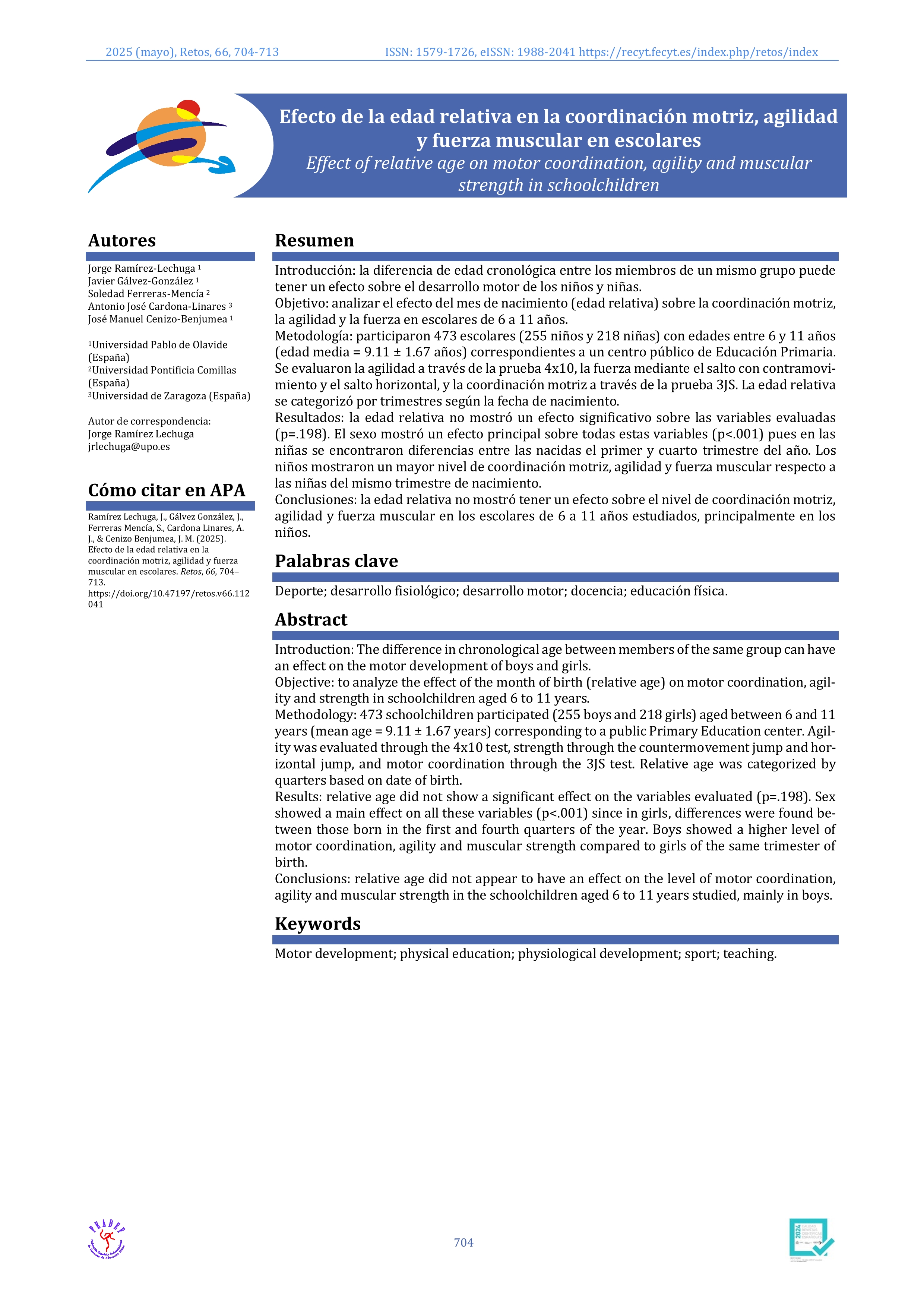 | Página principal > Artículos > Efecto de la edad relativa en la coordinación motriz, agilidad y fuerza muscular en escolares |