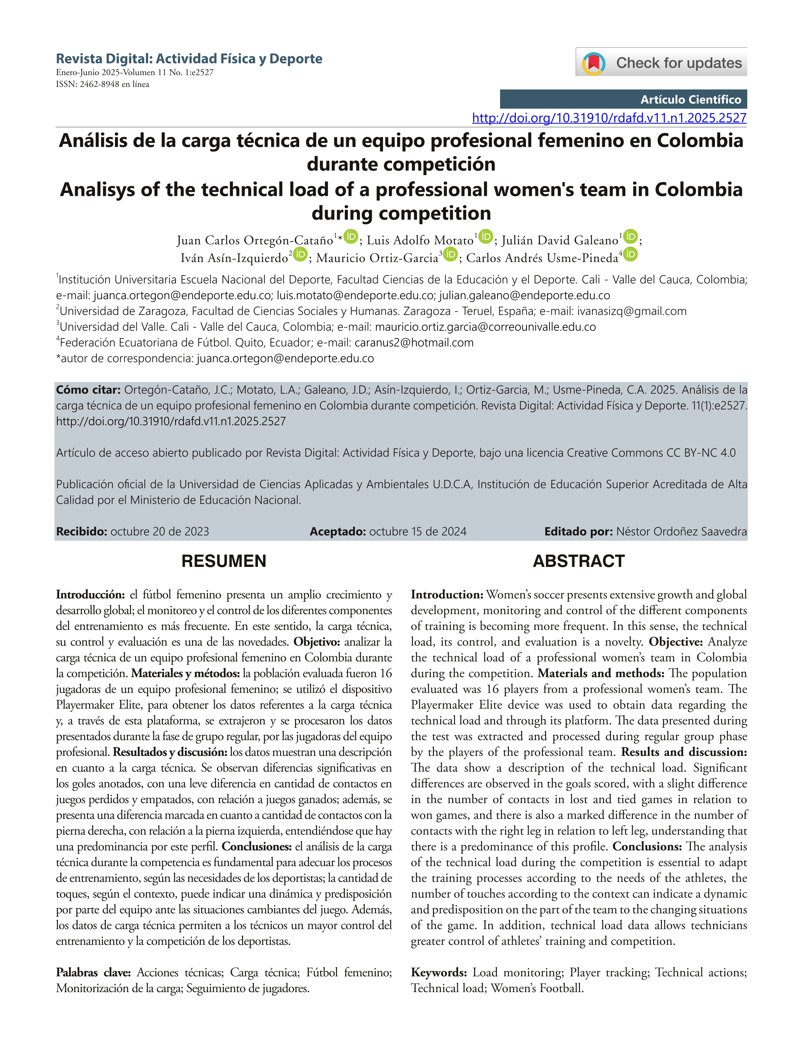 | Página principal > Artículos > Análisis de la carga técnica de un equipo profesional femenino en Colombia durante competición |