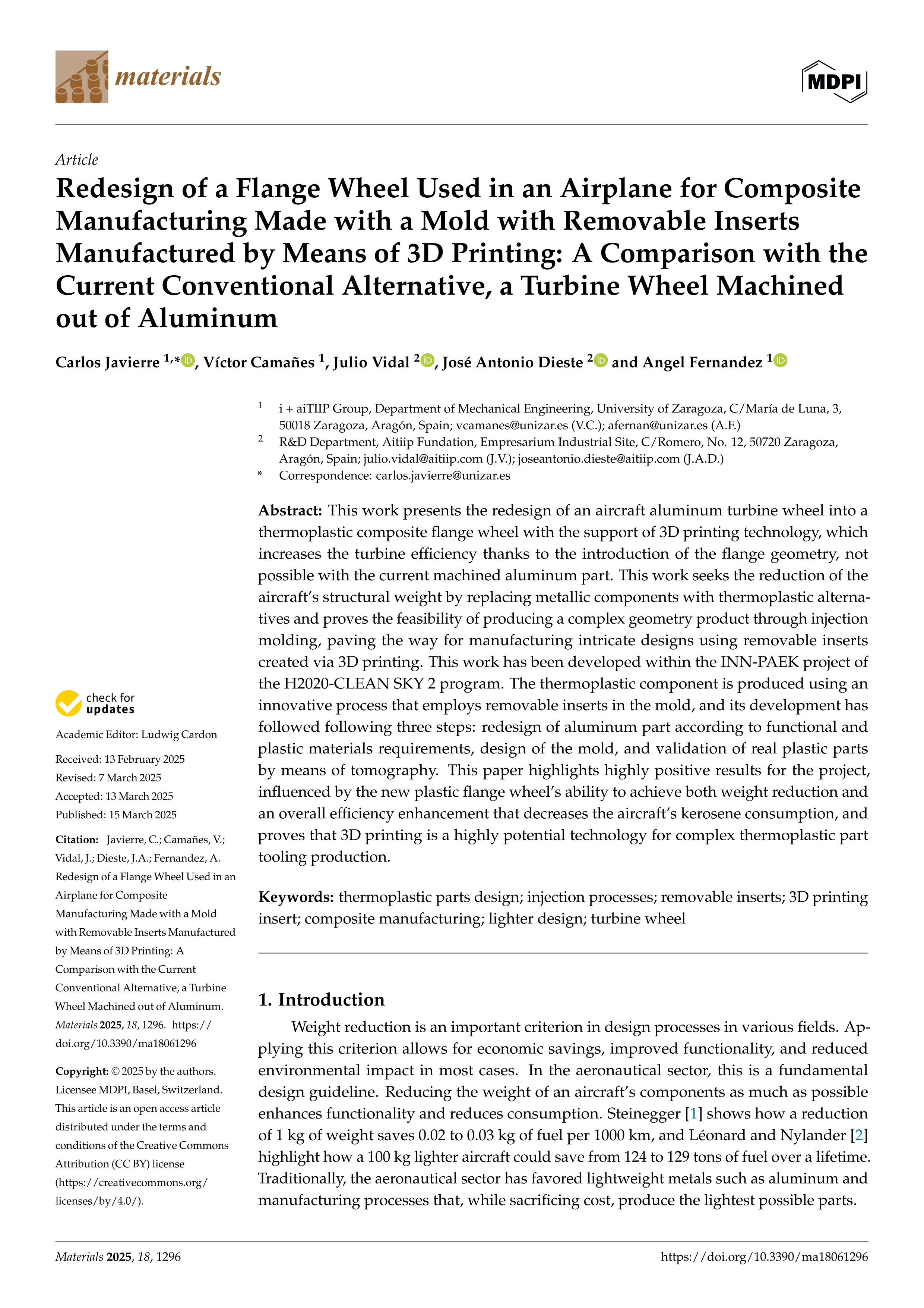 Redesign of a flange wheel used in an airplane for composite manufacturing made with a mold with removable inserts manufactured by means of 3d printing: a comparison with the current conventional alternative, a turbine wheel machined out of aluminum