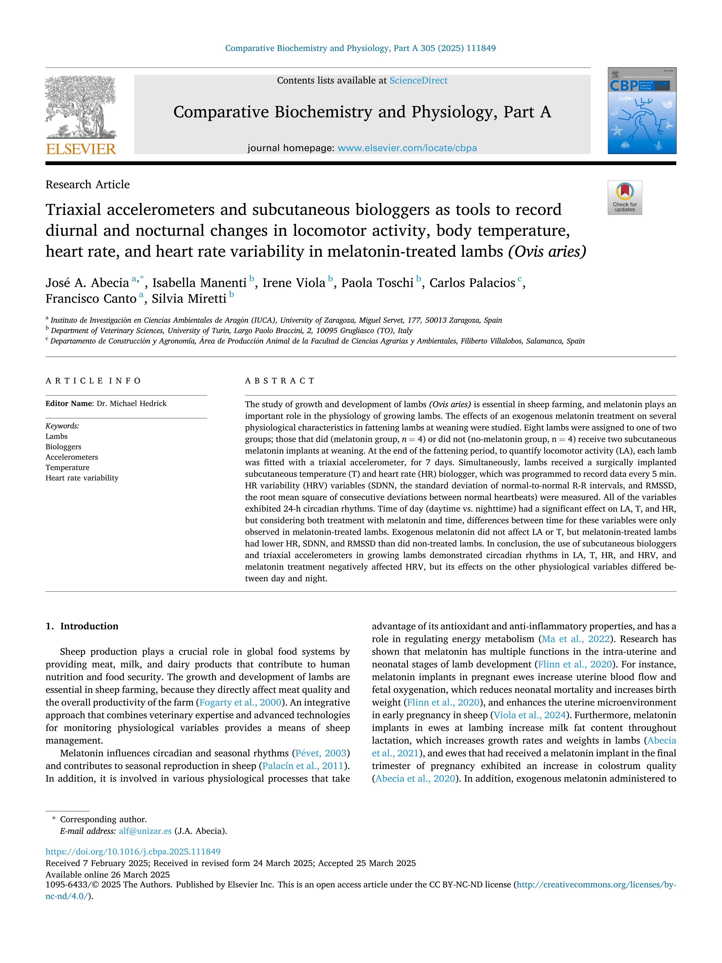 | Accueil > articulos > Triaxial accelerometers and subcutaneous biologgers as tools to record diurnal and nocturnal changes in locomotor activity, body temperature, heart rate, and heart rate variability in melatonin-treated lambs (Ovis aries) |