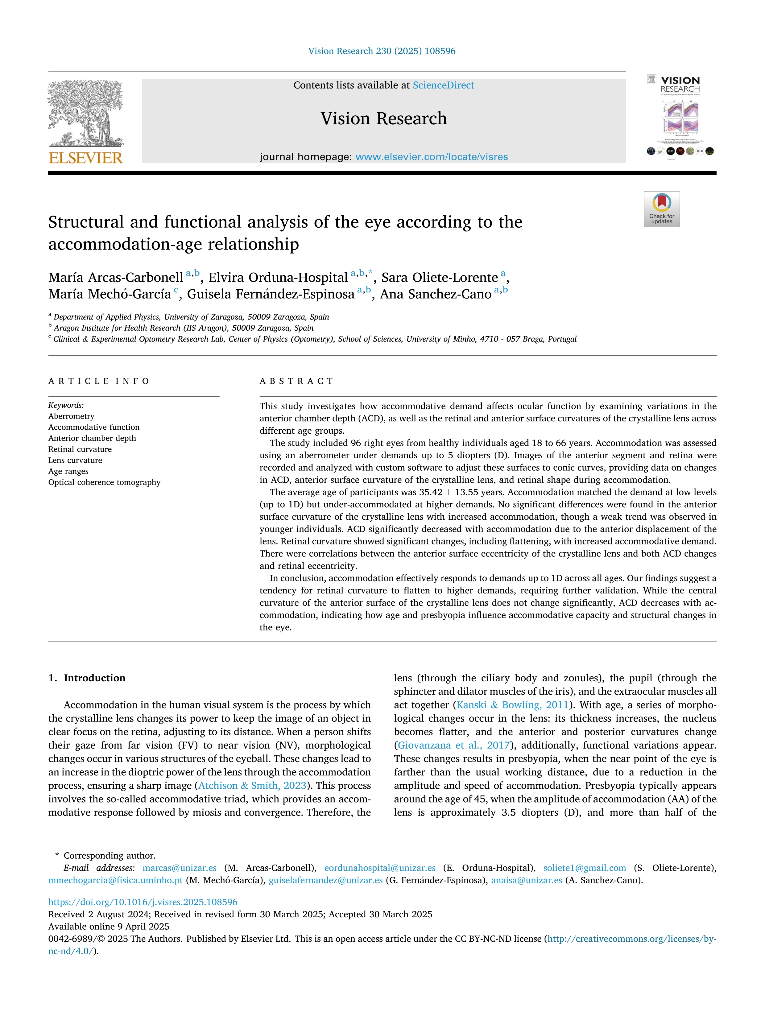 In conclusion, accommodation effectively responds to demands up to 1D across all ages. Our findings suggest a tendency for retinal curvature to flatten to higher demands, requiring further validation. While the central curvature of the anterior surface of the crystalline lens does not change significantly, ACD decreases with accommodation, indicating how age and presbyopia influence accommodative capacity and structural changes in the eye. Idioma: Inglés DOI: 10.1016/j.visres.2025.108596 Año: 2025 Publicado en: VISION RESEARCH 230 (2025), 108596 [11 pp.] ISSN: 0042-6989 Tipo y forma: Artículo (Versión definitiva) Área (Departamento): Área Óptica (Dpto. Física Aplicada)