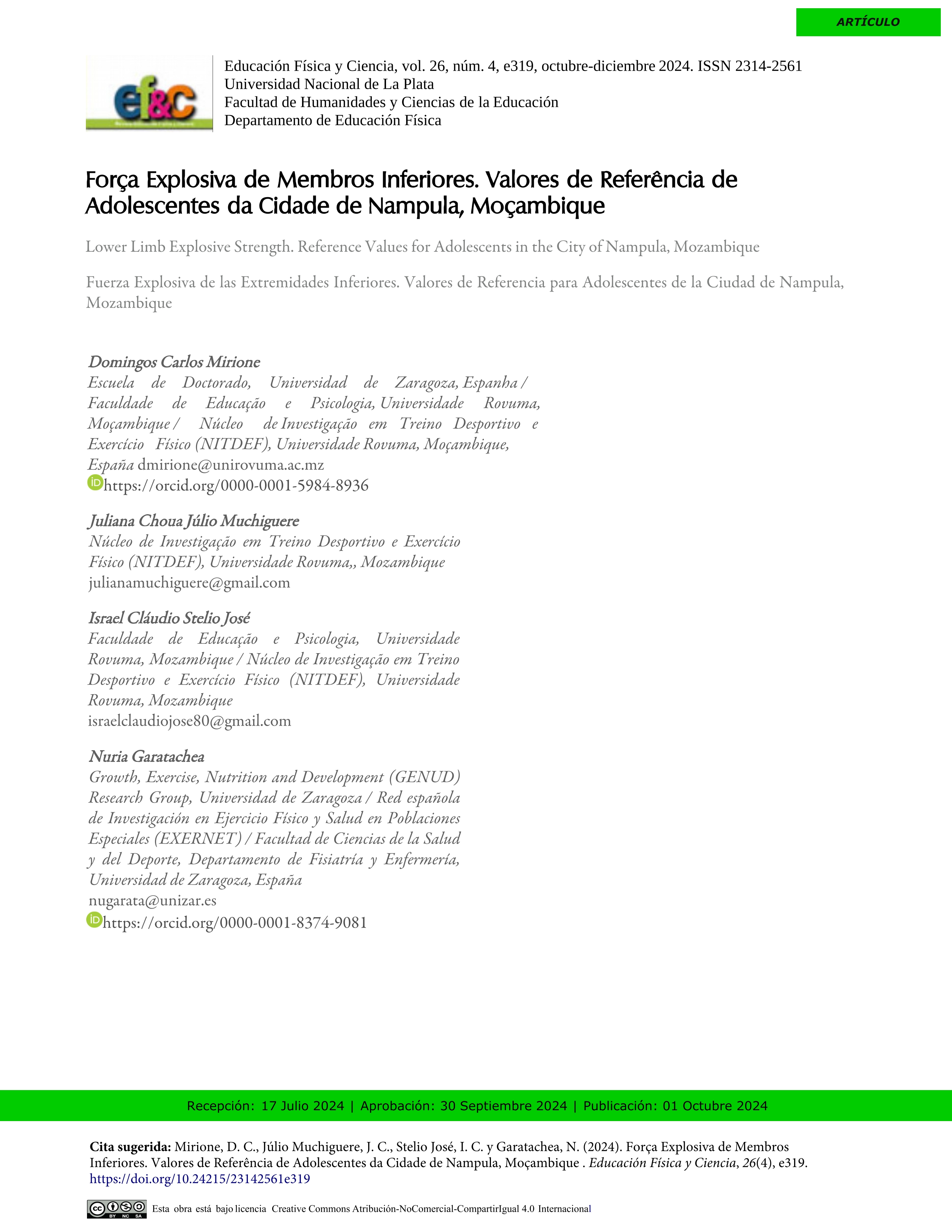 | Página principal > Artículos > Força Explosiva de Membros Inferiores. Valores de Referência de Adolescentes da Cidade de Nampula, Moçambique |