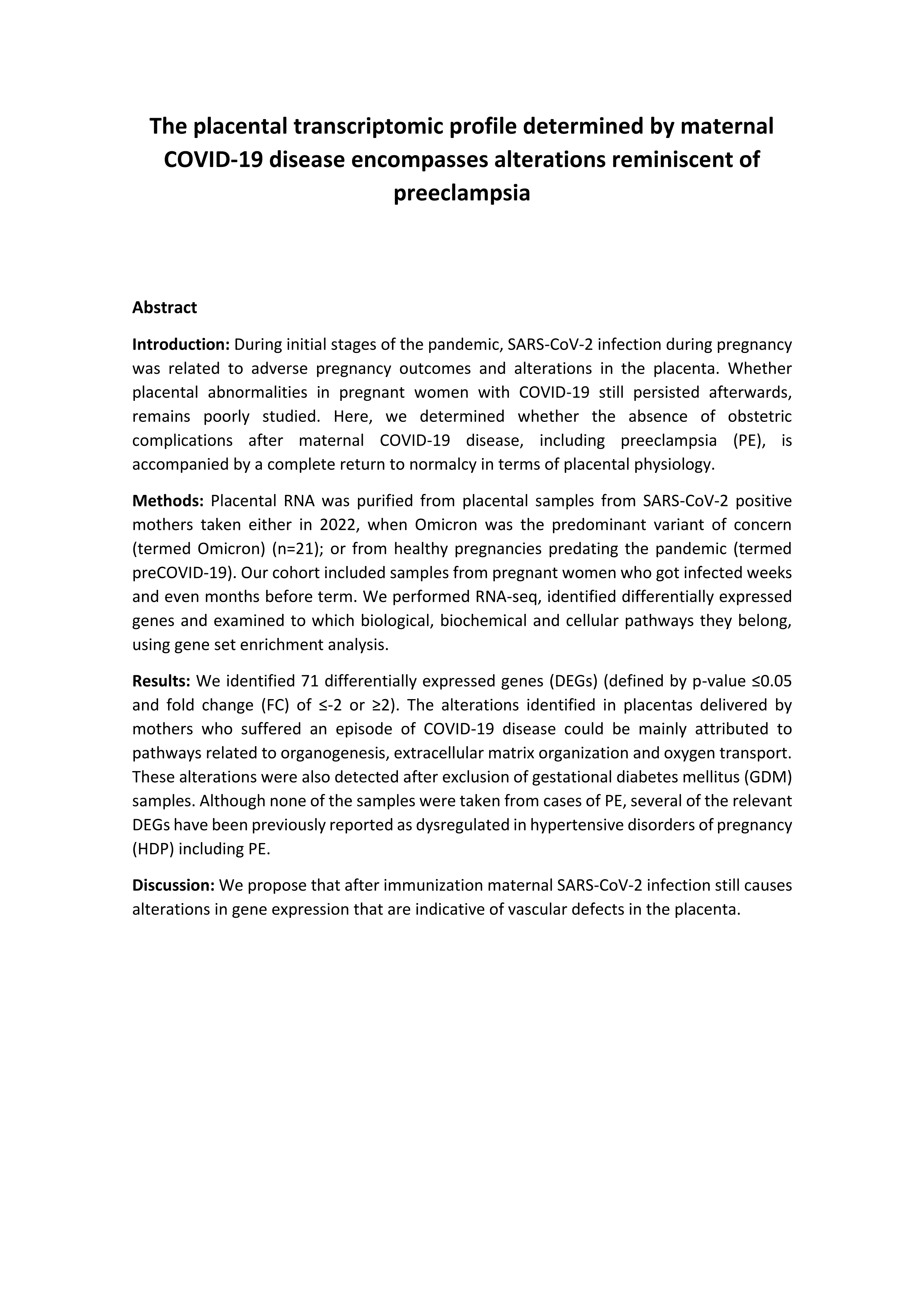 | Página principal > Artículos > The placental transcriptomic profile determined by maternal COVID-19 disease encompasses alterations reminiscent of preeclampsia |