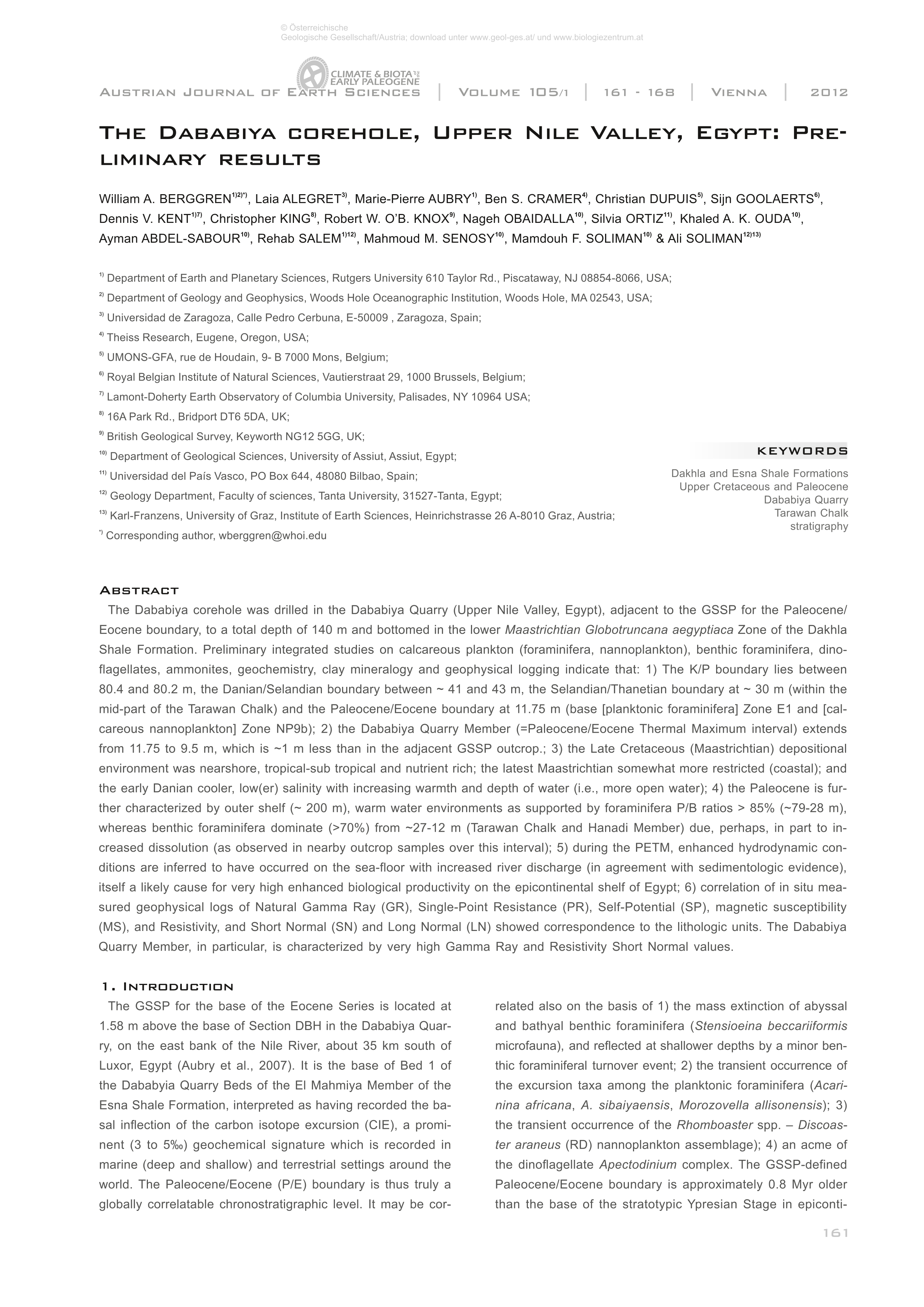Resumen: The Dababiya corehole was drilled in the Dababiya Quarry (Upper Nile Valley, Egypt), adjacent to the GSSP for the Paleocene/ Eocene boundary, to a total depth of 140 m and bottomed in the lower Maastrichtian Globotruncana aegyptiaca Zone of the Dakhla Shale Formation. Preliminary integrated studies on calcareous plankton (foraminifera, nannoplankton), benthic foraminifera, dinoflagellates, ammonites, geochemistry, clay mineralogy and geophysical logging indicate that: 1) The K/P boundary lies between 80.4 and 80.2 m, the Danian/Selandian boundary between ~ 41 and 43 m, the Selandian/Thanetian boundary at ~ 30 m (within the mid-part of the Tarawan Chalk) and the Paleocene/Eocene boundary at 11.75 m (base [planktonic foraminifera] Zone E1 and [calcareous nannoplankton] Zone NP9b); 2) the Dababiya Quarry Member (=Paleocene/Eocene Thermal Maximum interval) extends from 11.75 to 9.5 m, which is ~1 m less than in the adjacent GSSP outcrop.; 3) the Late Cretaceous (Maastrichtian) depositional environment was nearshore, tropical-sub tropical and nutrient rich; the latest Maastrichtian somewhat more restricted (coastal); and the early Danian cooler, low(er) salinity with increasing warmth and depth of water (i.e., more open water); 4) the Paleocene is further characterized by outer shelf (~ 200 m), warm water environments as supported by foraminifera P/B ratios > 85% (~79-28 m), whereas benthic foraminifera dominate (>70%) from ~27-12 m (Tarawan Chalk and Hanadi Member) due, perhaps, in part to increased dissolution (as observed in nearby outcrop samples over this interval); 5) during the PETM, enhanced hydrodynamic conditions are inferred to have occurred on the sea-floor with increased river discharge (in agreement with sedimentologic evidence), itself a likely cause for very high enhanced biological productivity on the epicontinental shelf of Egypt; 6) correlation of in situ measured geophysical logs of Natural Gamma Ray (GR), Single-Point Resistance (PR), Self-Potential (SP), magnetic susceptibility (MS), and Resistivity, and Short Normal (SN) and Long Normal (LN) showed correspondence to the lithologic units. The Dababiya Quarry Member, in particular, is characterized by very high Gamma Ray and Resistivity Short Normal values. Idioma: Inglés Año: 2012 Publicado en: AUSTRIAN JOURNAL OF EARTH SCIENCES 105, 1 (2012), 161-168 ISSN: 0251-7493 Factor impacto JCR: 0.538 (2012) Categ. JCR: GEOSCIENCES, MULTIDISCIPLINARY rank: 151 / 172 = 0.878 (2012) - Q4 - T3 Tipo y forma: Artículo (Versión definitiva) Área (Departamento): Área Paleontología (Dpto. Ciencias de la Tierra)