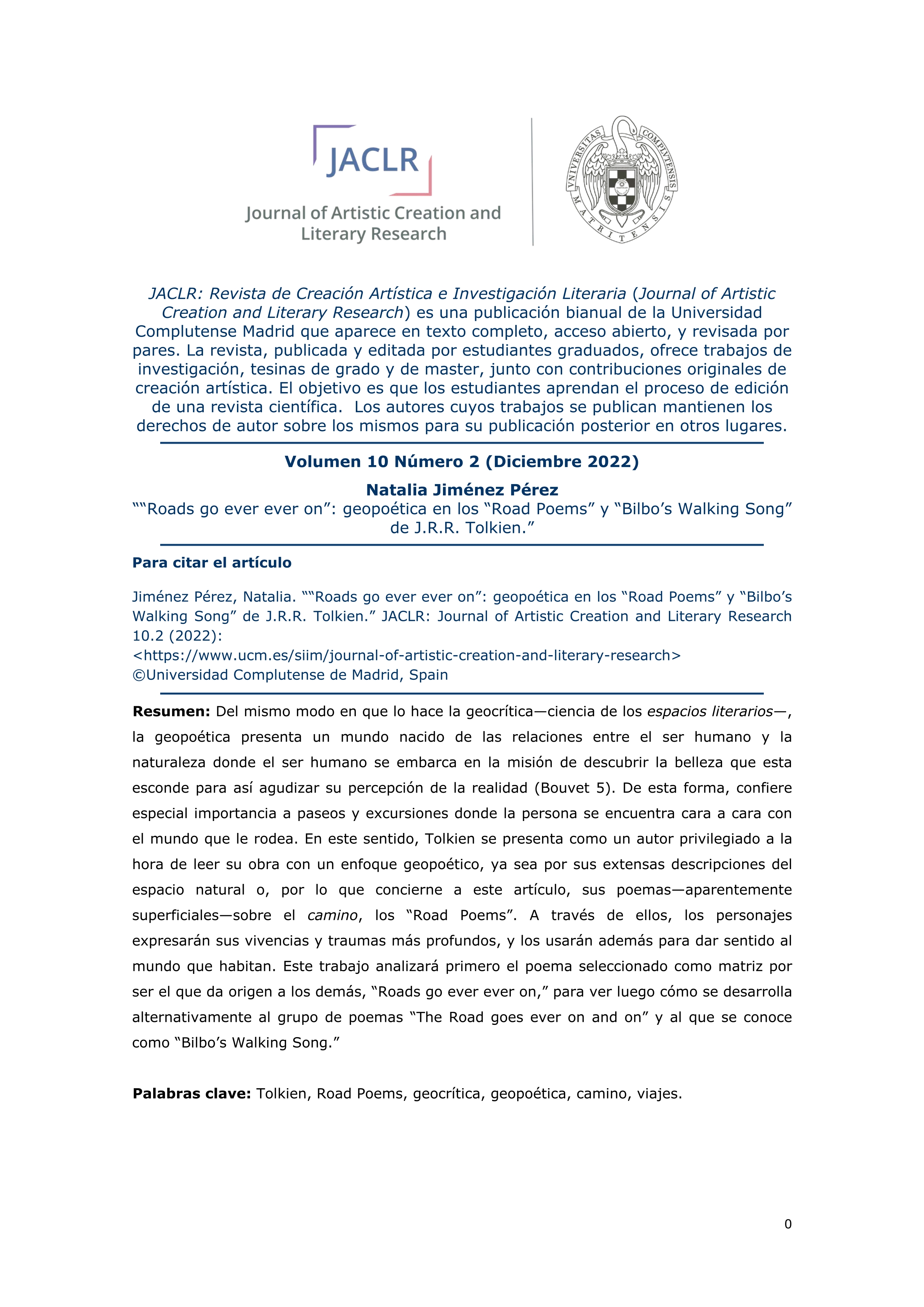 Resumen: Del mismo modo en que lo hace la geocrítica—ciencia de los espacios literarios—, la geopoética presenta un mundo nacido de las relaciones entre el ser humano y la naturaleza donde el ser humano se embarca en la misión de descubrir la belleza que esta esconde para así agudizar su percepción de la realidad (Bouvet 5). De esta forma, confiere especial importancia a paseos y excursiones donde la persona se encuentra cara a cara con el mundo que le rodea. En este sentido, Tolkien se presenta como un autor privilegiado a la hora de leer su obra con un enfoque geopoético, ya sea por sus extensas descripciones del espacio natural o, por lo que concierne a este artículo, sus poemas—aparentemente superficiales—sobre el camino, los “Road Poems”. A través de ellos, los personajes expresarán sus vivencias y traumas más profundos, y los usarán además para dar sentido al mundo que habitan. Este trabajo analizará primero el poema seleccionado como matriz por ser el que da origen a los demás, “Roads go ever ever on,” para ver luego cómo se desarrolla alternativamente al grupo de poemas “The Road goes ever on and on” y al que se conoce como “Bilbo’s Walking Song". Idioma: Inglés Año: 2022 Publicado en: Journal of artistic creation and literary research 10, 2 (2022), [15 pp.] ISSN: 2340-650X Originalmente disponible en: Texto completo de la revista