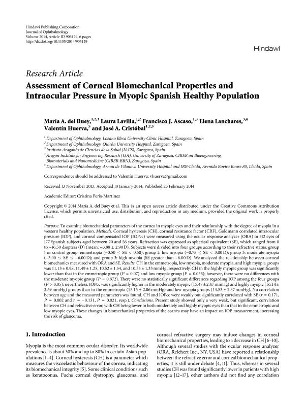 Assessment of corneal biomechanical properties and intraocular pressure in myopic Spanish healthy population