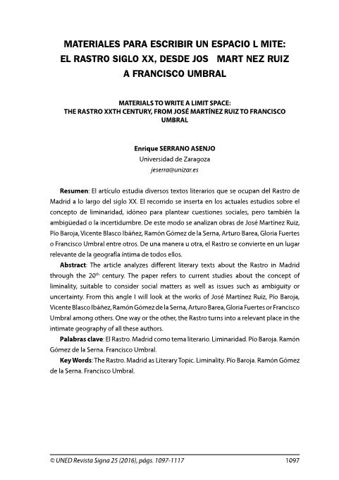 | Página principal > Artículos > Materiales para escribir un espacio límite: El Rastro siglo XX, desde José Martínez Ruiz a Francisco Umbral > Acceso al texto completo |