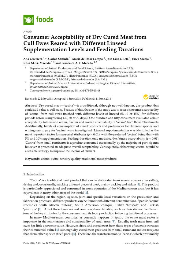 Resumen: Dry cured meatcecina''is a traditional, although not well-known, dry product that could add value to cull ewes. Because of this, the aim of the study was to assess consumer acceptability of cecina'' from cull ewes finished with different levels of linseed (5, 10 or 15%) for different periods before slaughtering (30, 50 or 70 days). One hundred and fifty consumers evaluated colour acceptability, fatness and odour, flavour and overall acceptability of cecina'' from those 9 treatments. Additionally, habits of consumption of cured products and preferences for different species and willingness to pay for cecina'' were investigated. Linseed supplementation was identified as the most important factor for sensorial attributes (p < 0.01), with the preferred cecina'' being that with 5% and 10% supplementation. Feeding duration only modified the fatness acceptability (p < 0.01). Cecina'' from small ruminants is a product consumed occasionally by the majority of participants; however, it presented an adequate overall acceptability. Consequently, elaborating cecina'' would be a feasible strategy to improve the income of farmers.
