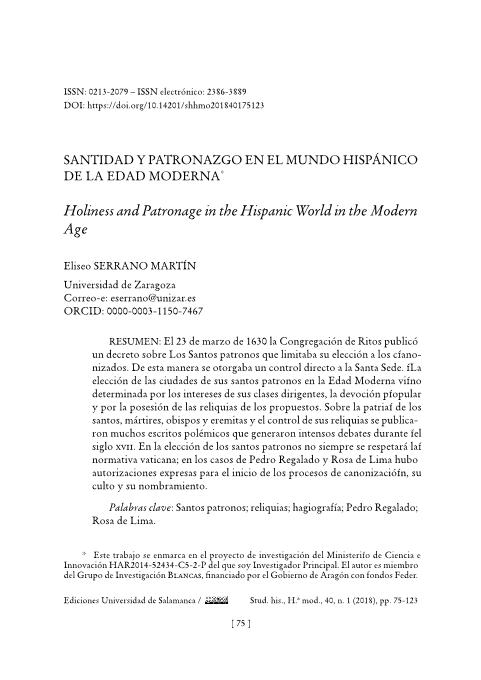 On March 23, 1630 the Congregation of rites issued a decree on the patron saints that limited their choice to the canonized. In this way direct control was granted to the Holy See. The choice of the cities of their patron saints in the modern age was determined by the interests of their ruling classes, the popular devotion and by the possession of the relics of the proposed saints. Concerning to the homeland of the Saints, martyrs, bishops and hermits, and the control of their relics were published many controversial writings that generated intense debates during the 17th century. In the election of the of the patron saints the Vatican regulation will not always be respected; in the case of Pedro Regalado and Rosa de Lima there were express authorization for the beginning of the canonization processes, his cult and their appointment. Idioma: Español DOI: 10.14201/shhmo201840175123 Año: 2018 Publicado en: STUDIA HISTORICA-HISTORIA MODERNA 40, 1 (2018), 75-123 ISSN: 0213-2079 Factor impacto SCIMAGO: 0.1 - History (Q4)