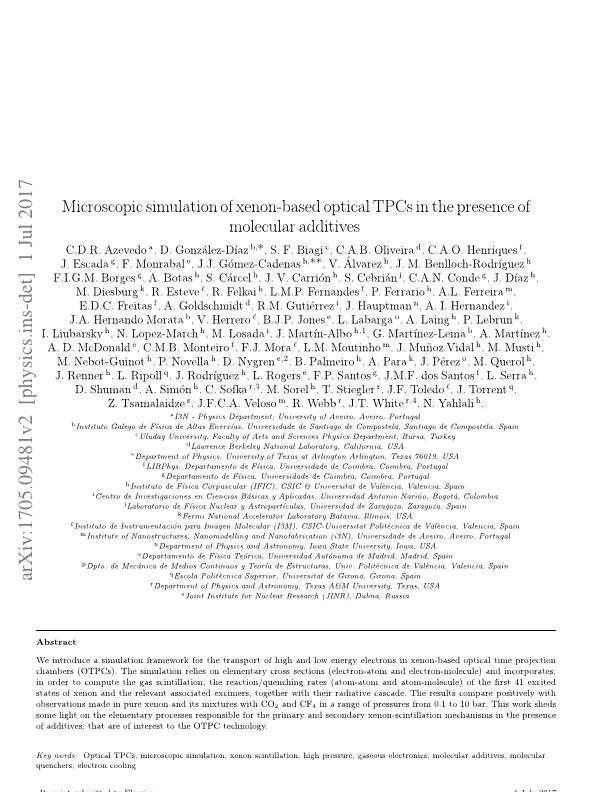Resumen: We introduce a simulation framework for the transport of high and low energy electrons in xenon-based optical time projection chambers (OTPCs). The simulation relies on elementary cross sections (electron–atom and electron–molecule) and incorporates, in order to compute the gas scintillation, the reaction/quenching rates (atom–atom and atom–molecule) of the first 41 excited states of xenon and the relevant associated excimers, together with their radiative cascade. The results compare positively with observations made in pure xenon and its mixtures with CO2 and CF4 in a range of pressures from 0.1 to 10 bar. This work sheds some light on the elementary processes responsible for the primary and secondary xenon-scintillation mechanisms in the presence of additives, that are of interest to the OTPC technology. Idioma: Inglés DOI: 10.1016/j.nima.2017.08.049 Año: 2018 Publicado en: NUCLEAR INSTRUMENTS & METHODS IN PHYSICS RESEARCH SECTION A-ACCELERATORS SPECTROMETERS DETECTORS AND ASSOCIATED EQUIPMENT 877 (2018), 157-172 ISSN: 0168-9002 Factor impacto JCR: 1.433 (2018) Categ. JCR: NUCLEAR SCIENCE & TECHNOLOGY rank: 11 / 34 = 0.324 (2018) - Q2 - T1 Categ. JCR: PHYSICS, NUCLEAR rank: 12 / 19 = 0.632 (2018) - Q3 - T2 Categ. JCR: INSTRUMENTS & INSTRUMENTATION rank: 39 / 61 = 0.639 (2018) - Q3 - T2 Categ. JCR: PHYSICS, PARTICLES & FIELDS rank: 23 / 29 = 0.793 (2018) - Q4 - T3 Factor impacto SCIMAGO: 0.686 - Nuclear and High Energy Physics (Q1) - Instrumentation (Q1)