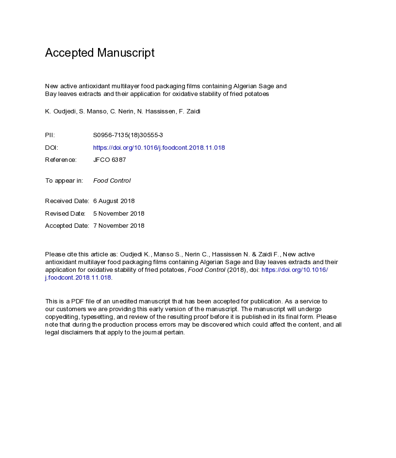 New active antioxidant multilayer food packaging films containing Algerian Sage and Bay leaves extracts and their application for oxidative stability of fried potatoes