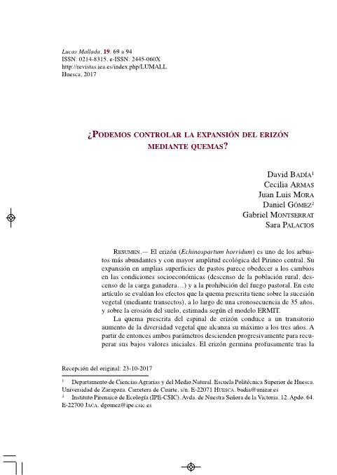 Resumen: El erizón (Echinospartum horridum) es uno de los arbustos más abundantes y con mayor amplitud ecológica del Pirineo central. Su expansión en amplias superficies de pastos parece obedecer a los cambios en las condiciones socioeconómicas (descenso de la población rural, descenso de la carga ganadera…) y a la prohibición del fuego pastoral. En este artículo se evalúan los efectos que la quema prescrita tiene sobre la sucesión vegetal (mediante transectos), a lo largo de una cronosecuencia de 35 años, y sobre la erosión del suelo, estimada según el modelo ERMIT. La quema prescrita del espinal de erizón conduce a un transitorio aumento de la diversidad vegetal que alcanza su máximo a los tres años. A partir de entonces ambos parámetros descienden progresivamente para recuperar sus bajos valores iniciales. El erizón germina profusamente tras la quema, ocupando una cuarta parte de la cubierta vegetal total a los dos o tres años y la mitad de la misma a los seis años. Se trata de un claro ejemplo de autosucesión vegetal posincendio, carácter propio de comunidades pirófitas. El resto de especies que colonizan temporalmente el espinal quemado tienen un valor pastoral bajo en relación con el pasto circundante que, además, suele ser excedentario para la carga ganadera que soporta actualmente. Por tanto, la quema del espinal de erizón, en las actuales condiciones, supone su rejuvenecimiento pero no su sustitución por otras comunidades. La superficie de suelo desnudo suele ser baja tras la quema prescrita generada en óptimas condiciones, inferior al 50%, al dejar muchos residuos (ramas y hojarasca más o menos chamuscadas) en superficie. Bajo esas condiciones y con laderas suaves se estima que pueden perderse unas 4 toneladas de suelo/ha para el primer año. Si la quema es de mayor severidad, y se produce en laderas de fuerte pendiente, se prevén mayores pérdidas de suelo, de unas 20 toneladas/ha para el primer año. Estos valores descienden progresivamente con el tiempo, tal y como se produce la recuperación de la cubierta vegetal. Idioma: Español Año: 2017 Publicado en: Lucas Mallada 19 (2017), 69-94 ISSN: 0214-8315 Tipo y forma: Artículo (Versión definitiva) Área (Departamento): Área Edafología y Quím.Agríco. (Dpto. CC.Agrar.y Medio Natural)