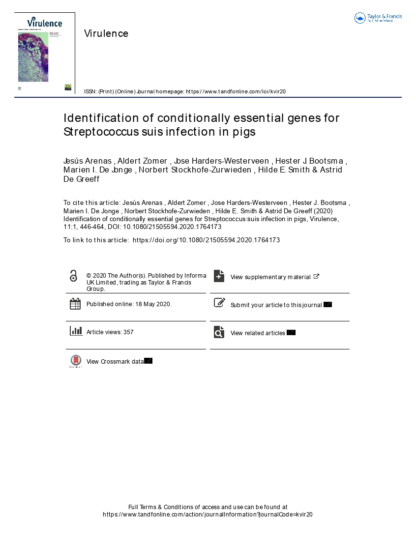 Resumen: Streptococcus suis is a Gram-positive bacterium and zoonotic pathogen that causes meningitis and sepsis in pigs and humans. The aim of this study was to identify genes required for S. suis infection. We created Tn-Seq libraries in a virulent S. suis strain 10, which was used to inoculate pigs in an intrathecal experimental infection. Comparative analysis of the relative abundance of mutants recovered from different sites of infection (blood, cerebrospinal fluid, and meninges of the brain) identified 361 conditionally essential genes, i.e. required for infection, which is about 18% of the genome. The conditionally essential genes were primarily involved in metabolic and transport processes, regulation, ribosomal structure and biogenesis, transcription, and cell wall membrane and envelope biogenesis, stress defenses, and immune evasion. Directed mutants were created in a set of 10 genes of different genetic ontologies and their role was determined in ex vivo models. Mutants showed different levels of sensitivity to survival in whole blood, serum, cerebrospinal fluid, thermic shock, and stress conditions, as compared to the wild type. Additionally, the role of three selected mutants was validated in co-infection experiments in which pigs were infected with both wild type and isogenic mutant strains. The genetic determinants of infection identified in this work contribute to novel insights in S. suis pathogenesis and could serve as targets for novel vaccines or antimicrobial drugs. Idioma: Inglés DOI: 10.1080/21505594.2020.1764173 Año: 2020 Publicado en: Virulence 11, 1 (2020), 446-464 ISSN: 2150-5594 Factor impacto JCR: 5.882 (2020) Categ. JCR: INFECTIOUS DISEASES rank: 12 / 92 = 0.13 (2020) - Q1 - T1 Categ. JCR: MICROBIOLOGY rank: 23 / 136 = 0.169 (2020) - Q1 - T1 Categ. JCR: IMMUNOLOGY rank: 44 / 162 = 0.272 (2020) - Q2 - T1 Factor impacto SCIMAGO: 1.927 - Immunology (Q1) - Infectious Diseases (Q1) - Parasitology (Q1) - Microbiology (medical) (Q1) - Microbiology (Q1)