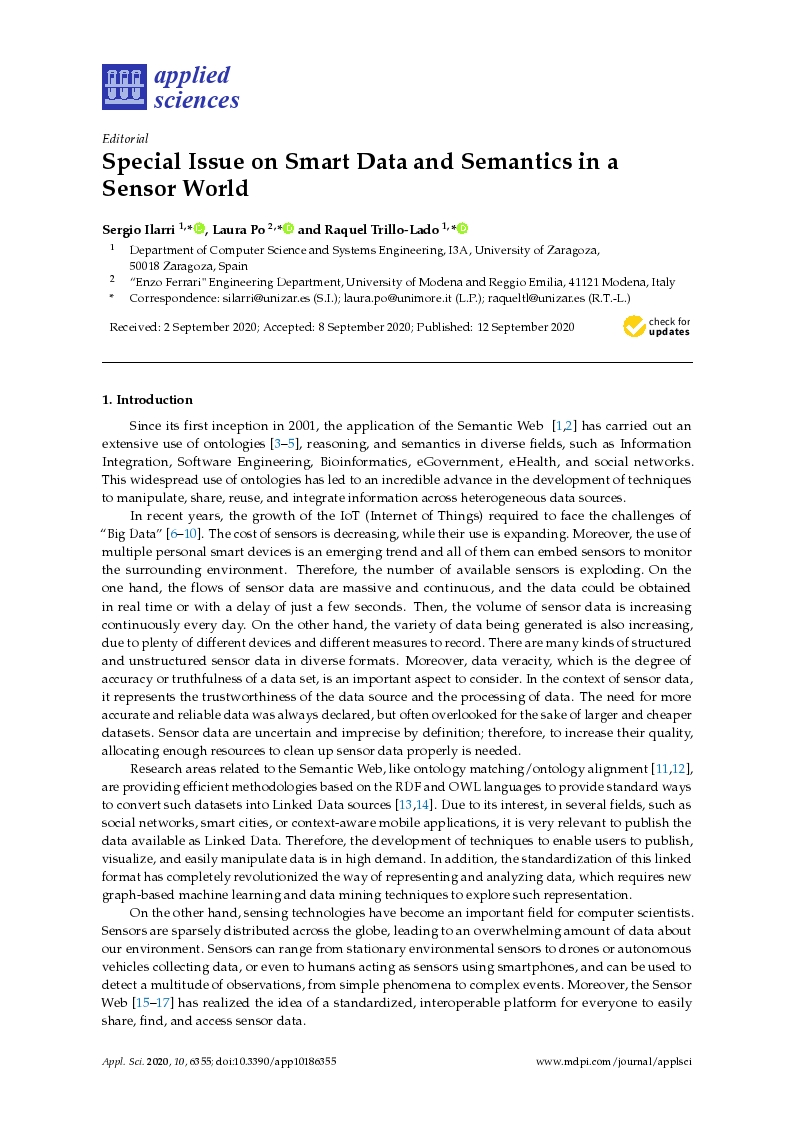 Since its first inception in 2001, the application of the Semantic Web [1, 2] has carried out an extensive use of ontologies [3–5], reasoning, and semantics in diverse fields, such as Information Integration, Software Engineering, Bioinformatics, eGovernment, eHealth, and social networks. This widespread use of ontologies has led to an incredible advance in the development of techniques to manipulate, share, reuse, and integrate information across heterogeneous data sources. In recent years, the growth of the IoT (Internet of Things) required to face the challenges of “Big Data” [6–10]. The cost of sensors is decreasing, while their use is expanding. Moreover, the use of multiple personal smart devices is an emerging trend and all of them can embed sensors to monitor the surrounding environment. Therefore, the number of available sensors is exploding. On the one hand, the flows of sensor data are massive and continuous, and the data could be obtained in real time or with a delay of just a few seconds. Then, the volume of sensor data is increasing continuously every day. On the other hand, the variety of data being generated is also increasing, due to plenty of different devices and different measures to record. There are many kinds of structured and unstructured sensor data in diverse formats. Moreover, data veracity, which is the degree of accuracy or truthfulness of a data set, is an important aspect to consider. In the context of sensor data, it represents the trustworthiness of the data source and the processing of data. The need for more accurate and reliable data was always declared, but often overlooked for the sake of larger and cheaper... Idioma: Inglés DOI: 10.3390/app10186355 Año: 2020 Publicado en: APPLIED SCIENCES-BASEL 10, 18 (2020), 6355 [4 pp] ISSN: 2076-3417 Factor impacto JCR: 2.679 (2020) Categ. JCR: PHYSICS, APPLIED rank: 73 / 160 = 0.456 (2020) - Q2 - T2 Categ. JCR: ENGINEERING, MULTIDISCIPLINARY rank: 38 / 91 = 0.418 (2020) - Q2 - T2 Categ. JCR: CHEMISTRY, MULTIDISCIPLINARY rank: 101 / 178 = 0.567 (2020) - Q3 - T2 Categ. JCR: MATERIALS SCIENCE, MULTIDISCIPLINARY rank: 201 / 333 = 0.604 (2020) - Q3 - T2 Factor impacto SCIMAGO: 0.435 - Computer Science Applications (Q2) - Engineering (miscellaneous) (Q2) - Process Chemistry and Technology (Q2) - Instrumentation (Q2) - Materials Science (miscellaneous) (Q2) - Fluid Flow and Transfer Processes (Q2)